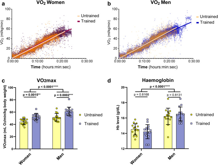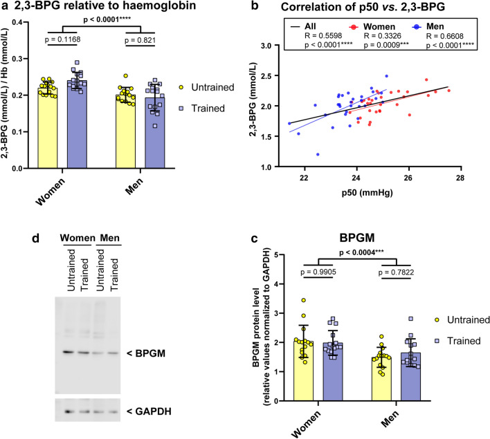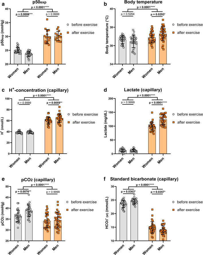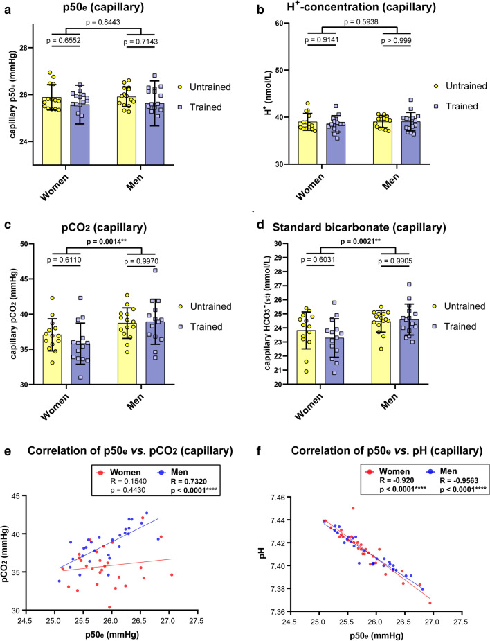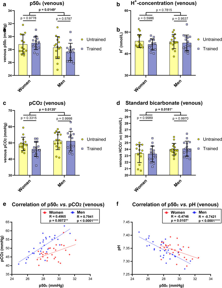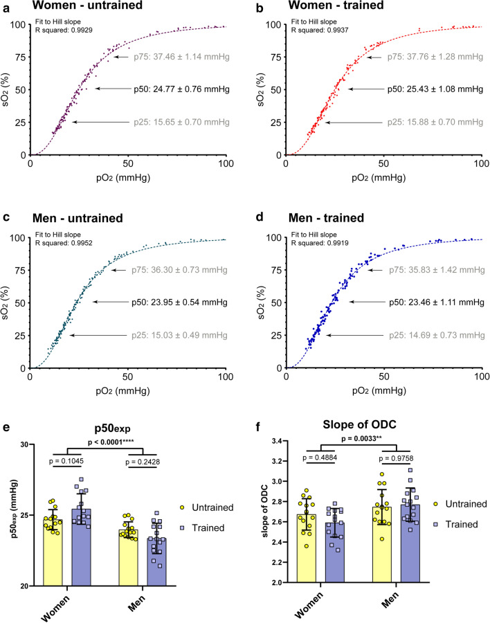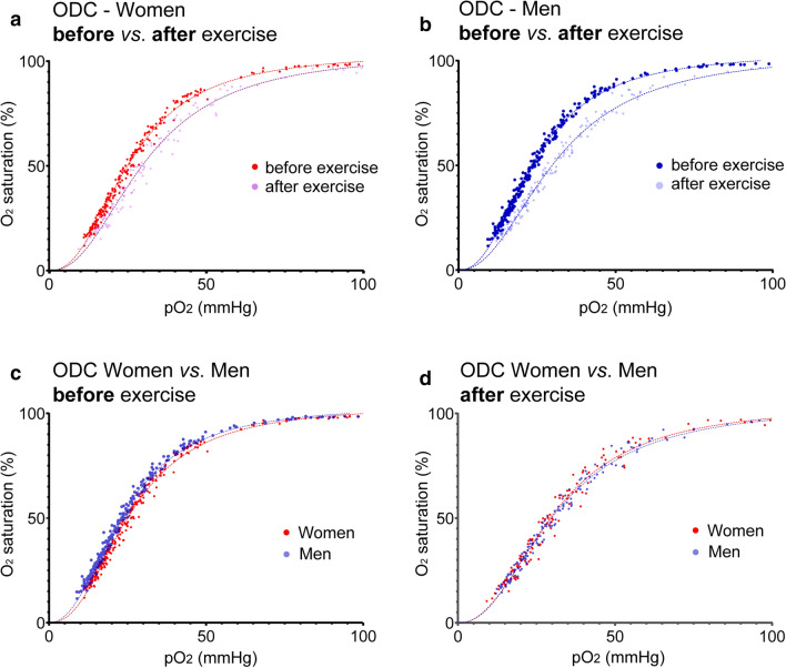 Oxygen affinity to haemoglobin is indicated by the p50 value (pO2 at 50% O2Hb) and critically determines cellular oxygen availability. Although high Hb-O2 affinity can cause tissue hypoxia under conditions of well O2 saturated blood, individual differences in p50 are commonly not considered in clinical routine. Here, we investigated the diversity in Hb-O2 affinity in the context of physiological relevance. Oxyhaemoglobin dissociation curves (ODCs) of 60 volunteers (18-40 years, both sexes, either endurance trained or untrained) were measured at rest and after maximum exercise (VO2max) test. At rest, p50 values of all participants ranged over 7 mmHg. For comparison, right shift of ODC after VO2max test, representing the maximal physiological range to release oxygen to the tissue, indicated a p50 difference of up to 10 mmHg. P50 at rest differs significantly between women and men, with women showing lower Hb-O2 affinity that is determined by higher 2,3-BPG and BPGM levels. Regular endurance exercise did not alter baseline Hb-O2 affinity. Thus, p50 diversity is already high at baseline level and needs to be considered under conditions of impaired tissue oxygenation. For fast prediction of Hb-O2 affinity by blood gas analysis, only venous but not capillary blood samples can be recommended.