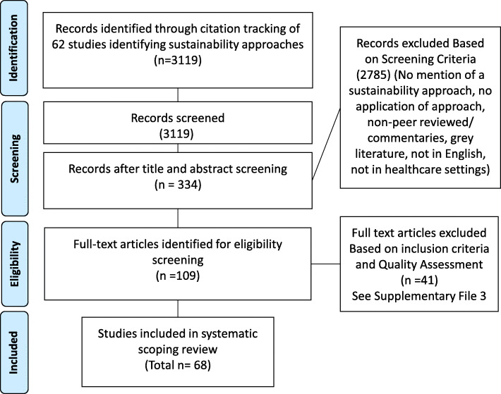 Methods: A systematic scoping review was designed to search for peer-reviewed publications detailing the use of sustainability approaches in practice. A 5-stage framework for scoping reviews directed the search strategy, and quality assessment was performed using the Mixed Method Appraisal Tool. Searches were performed through electronic citation tracking and snowballing of references. Articles were obtained through Web of Science, PubMed and Google Scholar. Six outcome variables for sustainability were explored to ascertain impact of approaches.