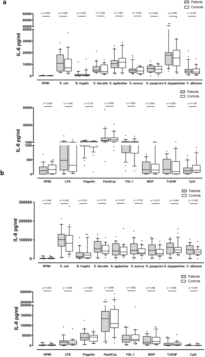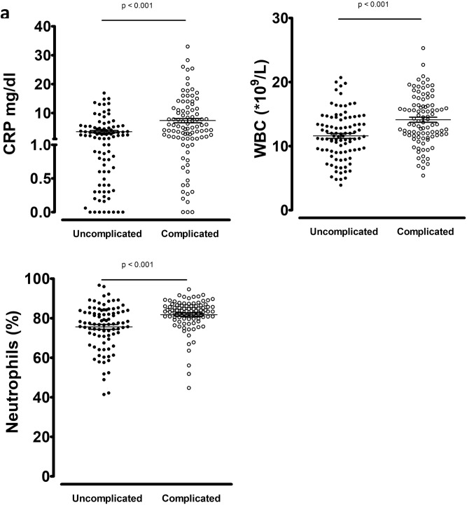 Acute appendicitis is a common surgical emergency worldwide. Exaggerated immune responses could be associated with appendicitis. This study aimed at characterizing immune responses towards a large variety of gut commensals and pathogens, and pattern recognition receptor (PRR) ligands, and investigating the course of systemic inflammation in a prospective cohort of acute appendicitis patients. PBMC responses of 23 patients of the cohort and 23 healthy controls were characterized more than 8 months post-surgery. Serum cytokine levels were measured in 23 patients at the time of appendicitis and after one month. CRP, WBC and percentage of neutrophils were analyzed in the total cohort of 325 patients. No differences in PBMC responses were found between patients and controls. Stronger IL-10 responses were found following complicated appendicitis. A trend towards lower IL-8 responses was shown following gangrenous appendicitis. Serum IL-10 and IL-6 were significantly elevated at presentation, and IL-6, IL-8 and TNF-α levels were higher in complicated appendicitis. Routine biomarkers could predict severity of appendicitis with high specificities, but low sensitivities. Cytokine responses in patients following acute appendicitis did not differ from healthy controls. Higher serum cytokine levels were found in acute complicated and gangrenous cases. Further research into discriminative biomarkers is warranted.