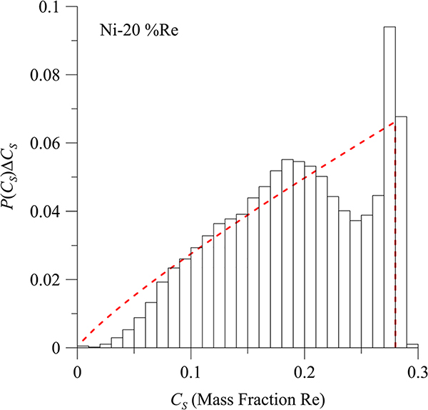 Differential thermal analysis (DTA) and microstructural and microprobe measurements of DTA and as-cast Ni-Re alloys with compositions between 0.20 and 0.44 mass fraction Re provide information to resolve differences in previously published Ni-Re phase diagrams. This investigation determines that the peritectic invariant between liquid, Re-rich hexagonal close packed and Ni-rich face center cubic phases, L + HCP → FCC, occurs at 1561.1 °C ± 3.4 °C (1σ) with compositions of liquid, FCC and HCP phases of 0.283 ± 0.036, 0.436 ± 0.026, and 0.828 ± 0.037 mass fraction Re, respectively. Analysis of the microsegregation in FCC alloys yields a partition coefficient for solidification, k = 1.54 ± 0.09 (mass frac./mass frac.). A small deviation from Scheil behavior due to dendrite tip kinetics is documented in as-cast samples. No evidence of an intermetallic phase is observed.