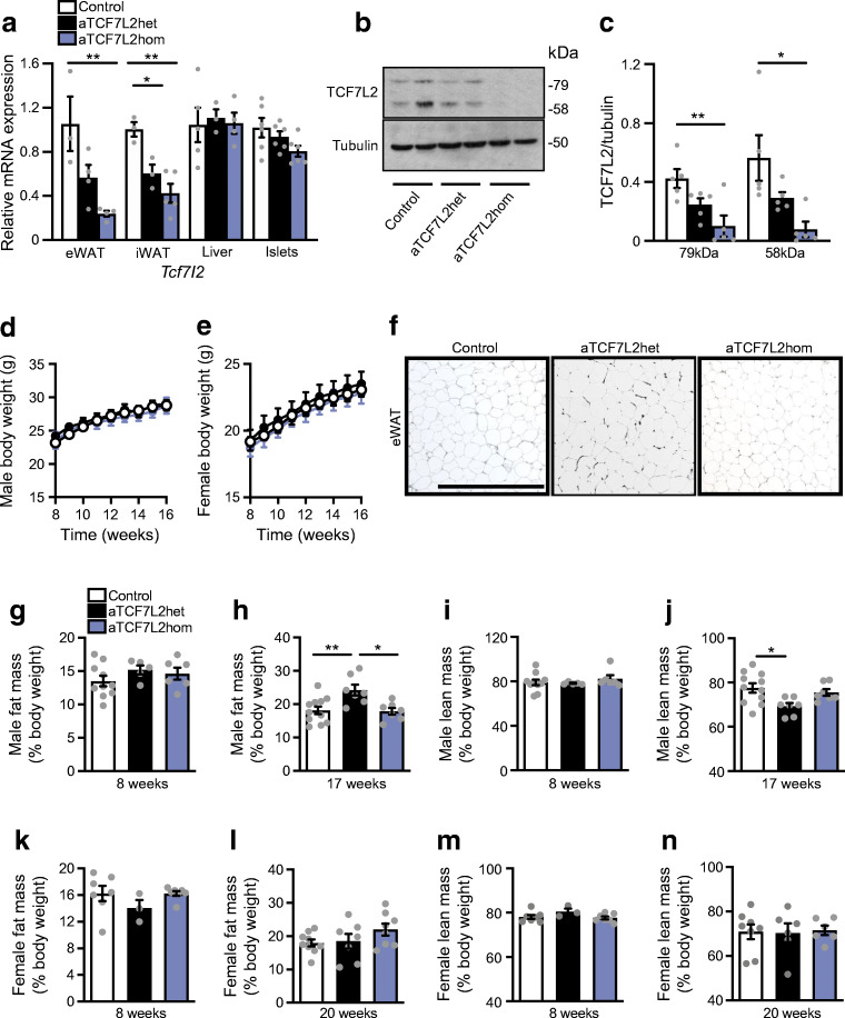 Conclusions/interpretation: Loss of Tcf7l2 gene expression selectively in adipocytes leads to a sexually dimorphic phenotype, with impairments not only in adipocytes, but also in pancreatic islet and enteroendocrine cells in male mice only. Our findings suggest novel roles for adipokines and incretins in the effects of diabetes-associated variants in TCF7L2, and further illuminate the roles of TCF7L2 in glucose homeostasis and diabetes risk. Graphical abstract.