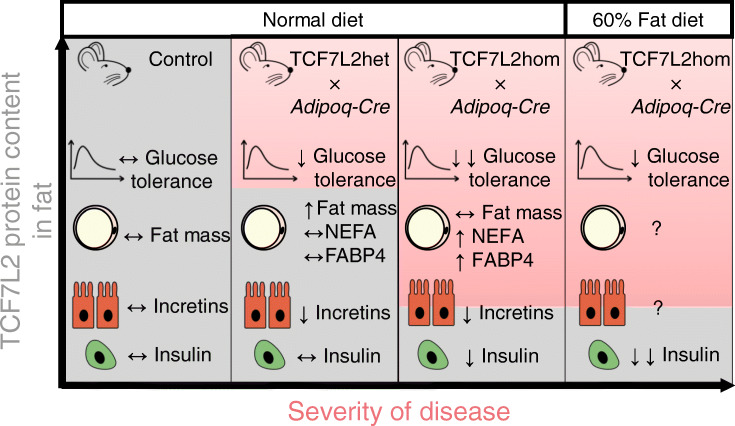 Results: Reduced TCF7L2 expression in adipocytes altered glucose tolerance and insulin secretion in male but not in female mice. Thus, on a normal chow diet, male heterozygote knockout mice (aTCF7L2het) exhibited impaired glucose tolerance at 16 weeks (p = 0.03) and increased fat mass (1.4 ± 0.1-fold, p = 0.007) but no changes in insulin secretion. In contrast, male homozygote knockout (aTCF7L2hom) mice displayed normal body weight but impaired oral glucose tolerance at 16 weeks (p = 0.0001). These changes were mechanistically associated with impaired in vitro glucose-stimulated insulin secretion (decreased 0.5 ± 0.1-fold vs control mice, p = 0.02) and decreased levels of the incretins glucagon-like peptide-1 and glucose-dependent insulinotropic polypeptide (0.6 ± 0.1-fold and 0.4 ± 0.1-fold vs control mice, p = 0.04 and p < 0.0001, respectively). Circulating levels of plasma NEFA and fatty acid binding protein 4 were increased by 1.3 ± 0.1-fold and 1.8 ± 0.3-fold vs control mice (p = 0.03 and p = 0.05, respectively). Following exposure to a high-fat diet for 12 weeks, male aTCF7L2hom mice exhibited reduced in vivo glucose-stimulated insulin secretion (0.5 ± 0.1-fold vs control mice, p = 0.02).
