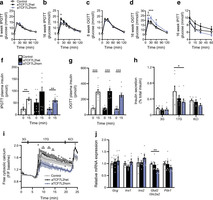 Methods: Tcf7l2 was selectively ablated in mature adipocytes in C57BL/6J mice using Cre recombinase under Adipoq promoter control to recombine Tcf7l2 alleles floxed at exon 1 (referred to as aTCF7L2 mice). aTCF7L2 mice were fed normal chow or a high-fat diet for 12 weeks. Glucose and insulin sensitivity, as well as beta cell function, were assessed in vivo and in vitro. Levels of circulating NEFA, selected hormones and adipokines were measured using standard assays.