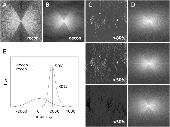 The complex environment of biological cells and tissues has motivated development of three-dimensional (3D) imaging in both light and electron microscopies. To this end, one of the primary tools in fluorescence microscopy is that of computational deconvolution. Wide-field fluorescence images are often corrupted by haze due to out-of-focus light, i.e., to cross-talk between different object planes as represented in the 3D image. Using prior understanding of the image formation mechanism, it is possible to suppress the cross-talk and reassign the unfocused light to its proper source post facto. Electron tomography based on tilted projections also exhibits a cross-talk between distant planes due to the discrete angular sampling and limited tilt range. By use of a suitably synthesized 3D point spread function, we show here that deconvolution leads to similar improvements in volume data reconstructed from cryoscanning transmission electron tomography (CSTET), namely a dramatic in-plane noise reduction and improved representation of features in the axial dimension. Contrast enhancement is demonstrated first with colloidal gold particles and then in representative cryotomograms of intact cells. Deconvolution of CSTET data collected from the periphery of an intact nucleus revealed partially condensed, extended structures in interphase chromatin.