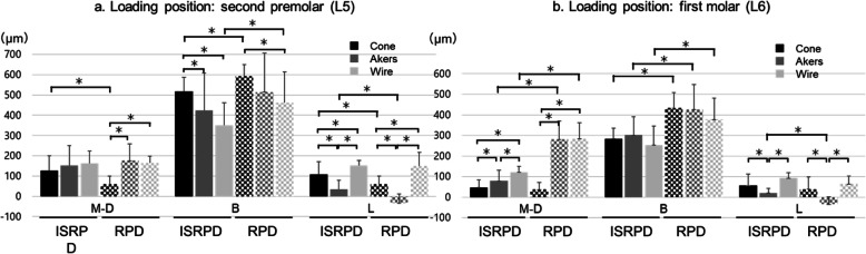 Results: Regardless of the rigidity of the direct retainers and loading positions, the displacement of the denture bases in the ISRPDs was significantly smaller than that in the RPDs (P < 0.001). There was no significant difference in vertical displacement of the denture bases among direct retainers with various connecting rigidities in the ISRPDs. Conversely, horizontal displacement of the abutment teeth in both the RPDs and ISRPDs tended to be larger with the cone crown telescope, which has high rigidity, than with the cast cingulum rest and wire clasp, which have much lower rigidities.