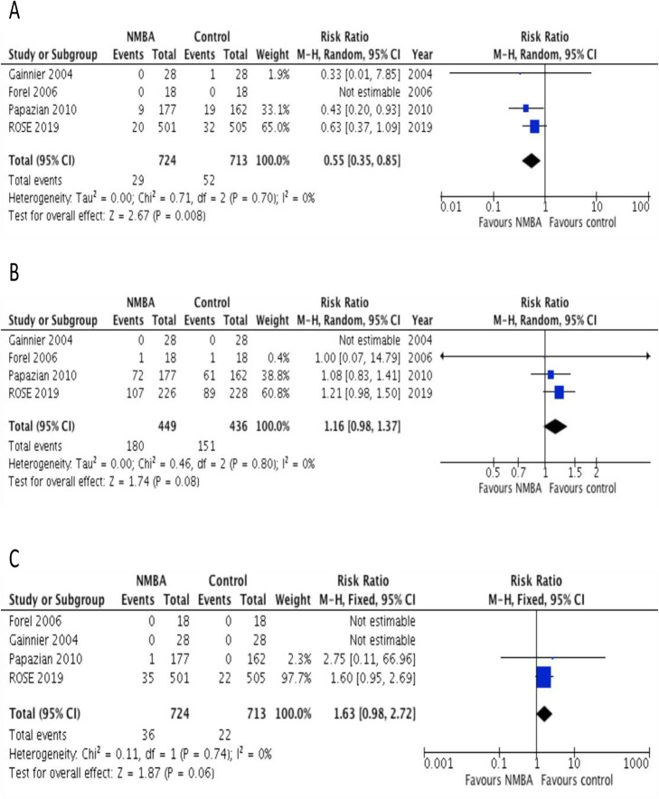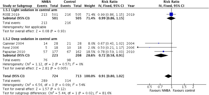 Results: Seven RCTs, including four new RCTs, met eligibility criteria for this review. These trials enrolled 1598 patients with moderate to severe ARDS at centers in the USA, France, and China. All trials assessed short-term continuous infusions of cisatracurium or vecuronium. The pooled estimate for mortality outcomes showed significant statistical heterogeneity, which was only explained by a subgroup analysis by depth of sedation in the control arm. A continuous NMBA infusion did not improve mortality when compared to a light sedation strategy with no NMBA infusion (relative risk [RR] 0.99; 95% CI 0.86-1.15; moderate certainty; P = 0.93). On the other hand, continuous NMBA infusion reduced mortality when compared to deep sedation with as needed NMBA boluses (RR 0.71; 95% CI 0.57-0.89; low certainty; P = 0.003). Continuous NMBA infusion reduced the rate of barotrauma (RR 0.55; 95% CI 0.35-0.85, moderate certainty; P = 0.008) across eligible trials, but the effect on ventilator-free days, duration of mechanical ventilation, and ICU-acquired weakness was uncertain.