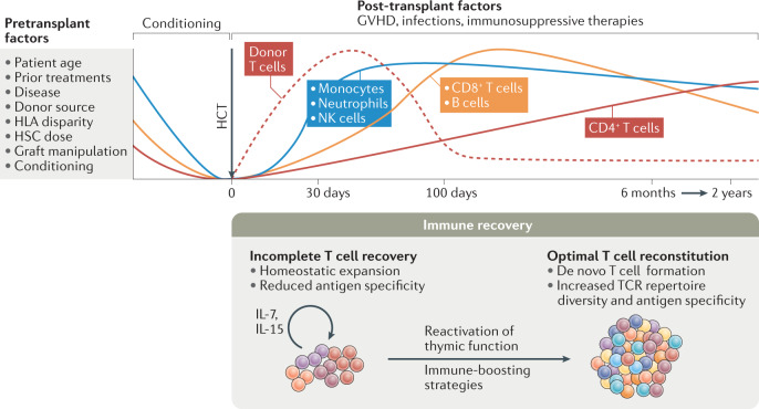 Following periods of haematopoietic cell stress, such as after chemotherapy, radiotherapy, infection and transplantation, patient outcomes are linked to the degree of immune reconstitution, specifically of T cells. Delayed or defective recovery of the T cell pool has significant clinical consequences, including prolonged immunosuppression, poor vaccine responses and increased risks of infections and malignancies. Thus, strategies that restore thymic function and enhance T cell reconstitution can provide considerable benefit to individuals whose immune system has been decimated in various settings. In this Review, we focus on the causes and consequences of impaired adaptive immunity and discuss therapeutic strategies that can recover immune function, with a particular emphasis on approaches that can promote a diverse repertoire of T cells through de novo T cell formation.