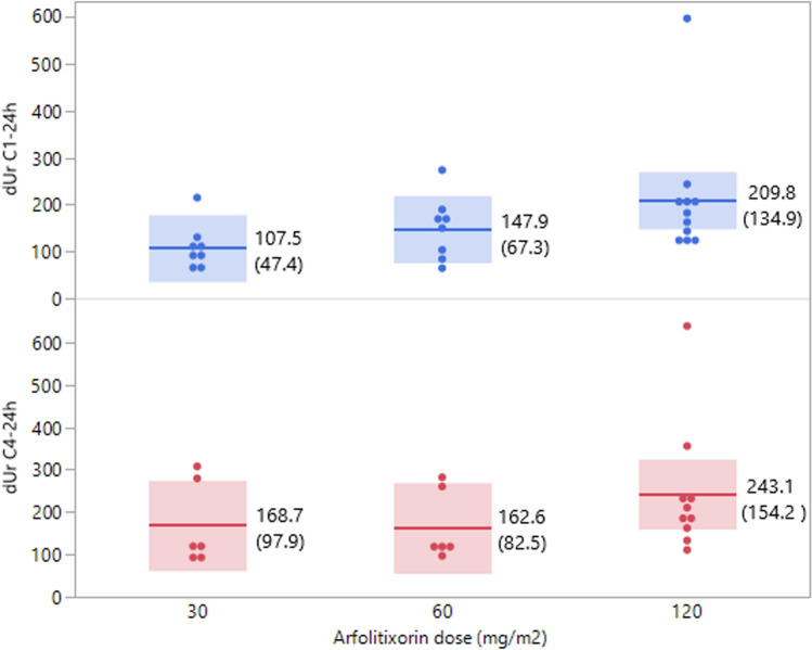 Methods: Thirty-three patients from the ISO-CC-005 phase I/IIa study, which investigated safety and tolerability of arfolitixorin at four dose levels, were included. Toxicity and clinical response were evaluated after 4 cycles of chemotherapy. Plasma dUr was quantified before (0 h) and 24 h after 5-FU administration at the first (C1) and fourth (C4) cycle using LC-MS/MS. Fit modelling was used to predict toxicity and clinical response.