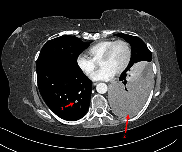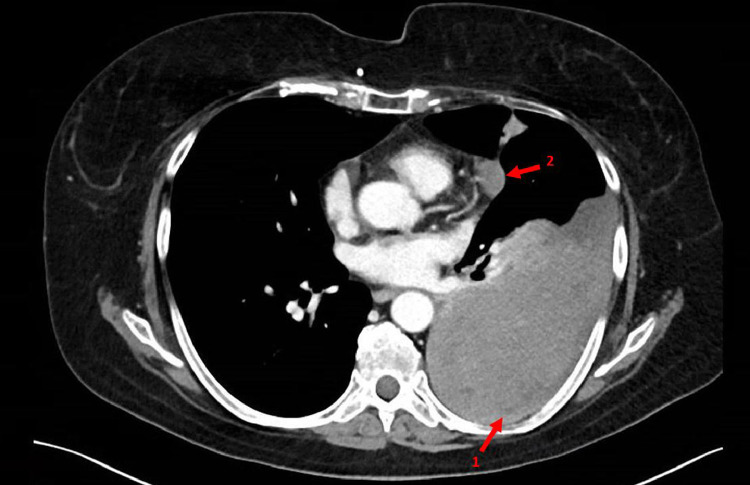 A 52-year-old woman presented to the emergency department with several days of progressive dyspnoea and thoracic pain. Her medical history included a (recurrent) anaplastic meningioma, for which she was treated with surgery and radiotherapy. A chest X-ray showed occurrence of total opacification of the left lower lobe and a chest computed tomography demonstrated a pleural mass of 12 × 9 × 15 cm in the left lower lobe. Biopsy of the pleural mass revealed a metastasis of the patient's anaplastic meningioma. Extracranial metastases from meningioma are extremely uncommon (≤ 0.1%-0.2% of cases), but important for a patient's prognosis.