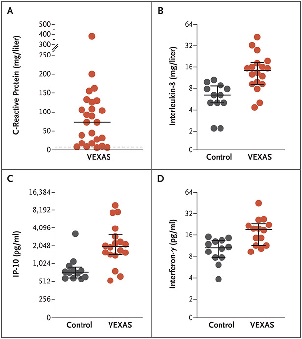 Conclusions: Using a genotype-driven approach, we identified a disorder that connects seemingly unrelated adult-onset inflammatory syndromes. We named this disorder the VEXAS (vacuoles, E1 enzyme, X-linked, autoinflammatory, somatic) syndrome. (Funded by the NIH Intramural Research Programs and the EU Horizon 2020 Research and Innovation Program.).