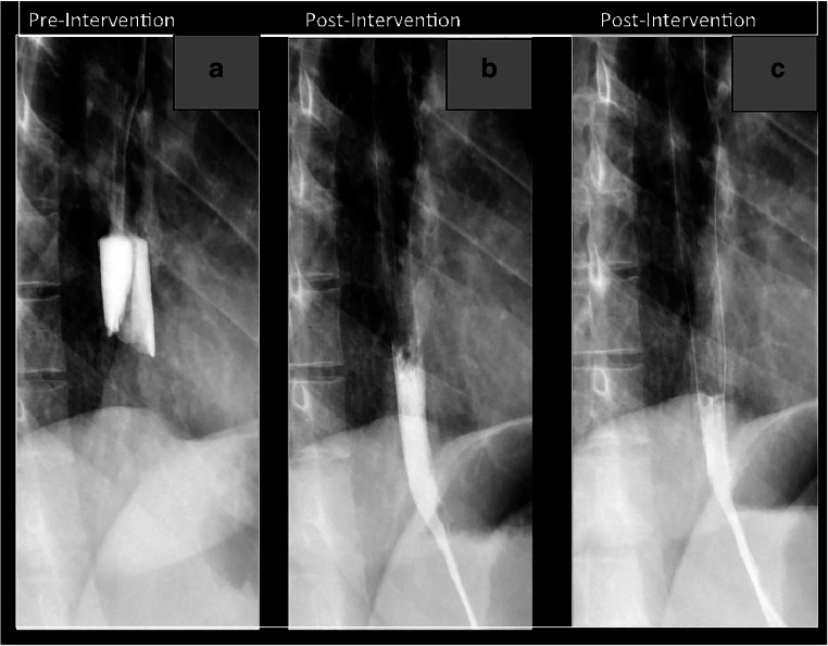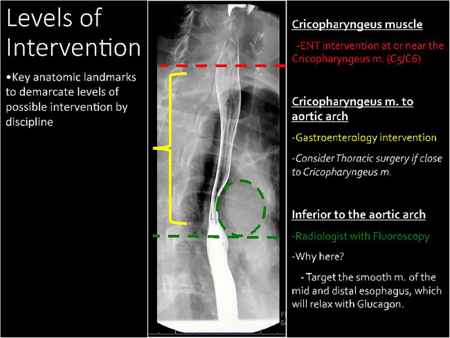 Fluoroscopy-guided esophageal disimpaction of ingested food is a safe, effective, and cost-efficient alternative to endoscopically guided disimpaction. Patients with suspected esophageal impaction usually require fluoroscopy to confirm the diagnosis and determine the level of obstruction, which guides further management. Proximal esophageal food impactions at or near the cricopharyngeus muscle require an ENT intervention. Food impactions from the cervical esophagus to the aortic arch require a GI intervention. Obstructions distal to the aortic arch can usually be managed by the radiologist with a fluoroscopy-guided disimpaction. The use of intravenous glucagon to relax the mid and distal esophageal smooth muscle, combined with an effervescent agent, and water comprises this "combination" therapy to relieve an acute esophageal food impaction. This paper reviews the indications, contraindications, technique, and 32 years of experience with fluoroscopy-guided esophageal disimpaction at our institution. A retrospective chart review of our experience includes 252 patients with a 56% success rate that obviated more expensive and invasive procedures. Only one complication of a minor mucosal tear of no clinical consequence was encountered. Radiologists should be familiar with the presentation and management of this common diagnosis.