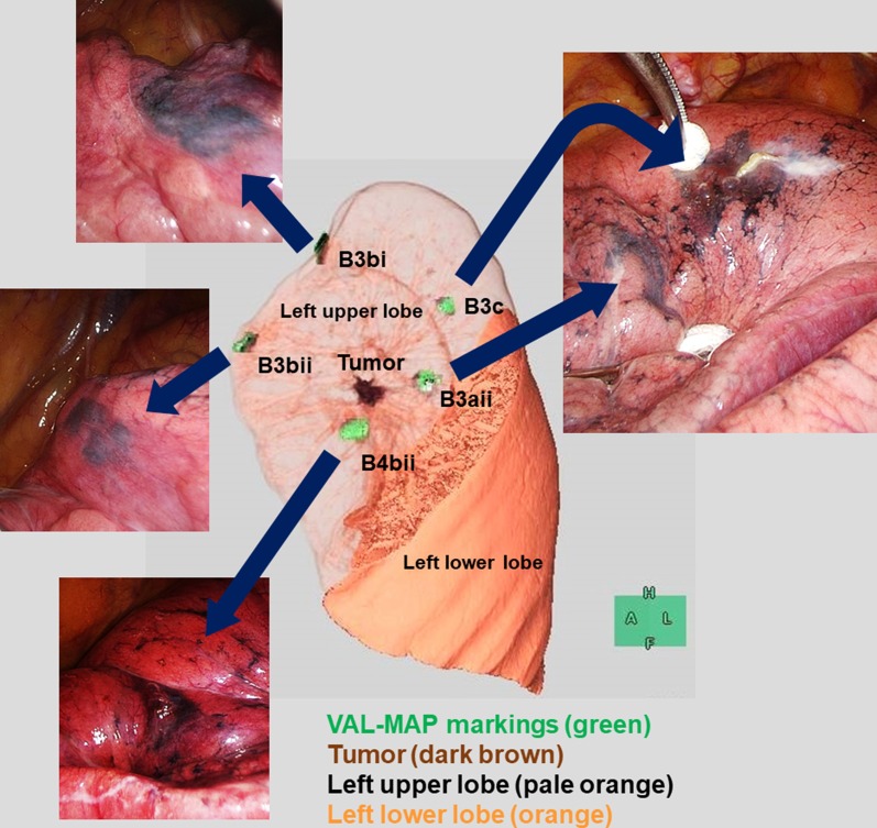 Clinical presentation: An asymptomatic 64-year-old man was referred to our department because of a lung nodule detected during his annual medical checkup. The chest computed-tomography image revealed a 16-mm, partly solid, ground-glass nodule in the left segment 4. Because the nodule was hardly palpable and deeply located between the left upper division segment and the left lingular segment, we performed VAL-MAP to facilitate extended left lingulectomy. Five dye markings were undertaken preoperatively. Surgery to remove the nodule was then conducted via complete three-port video-assisted thoracic surgery. The VAL-MAP markings were easily identified intraoperatively and helped locate the nodule. The intersegmental plane was identified by the ICG injection. The resection line was determined based on the intersegmental plane identified by the ICG injection and the site of the nodule suggested by the VAL-MAP markings. Following the resection line, we thoracoscopically achieved extended lingulectomy with sufficient surgical margins. The patient was discharged with no complications. The pathological diagnosis was adenocarcinoma in situ.