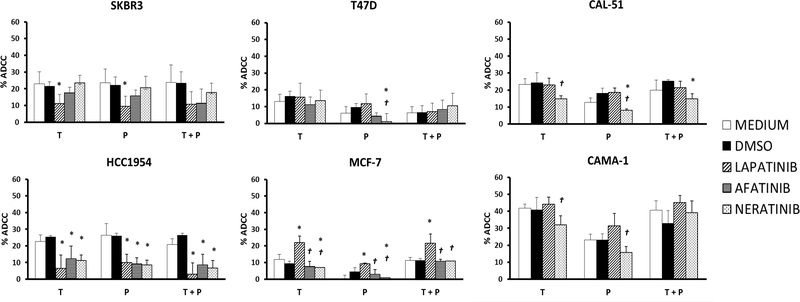 Results: Lapatinib significantly increased membrane HER2 levels, while afatinib and neratinib significantly decreased levels in all preclinical models. Single-agent lapatinib increased HER2 or EGFR levels in 10 of 11 (91%) tumor samples. NK cell signatures increased posttherapy (P = 0.03) and associated with trastuzumab response (P = 0.01). TKI treatment altered mAb-induced NK cell-mediated ADCC in vitro, but it did not consistently correlate with HER2 expression in HER2+ or HER2-low models. The ADCC response to trastuzumab and pertuzumab combined did not exceed either mAb alone.