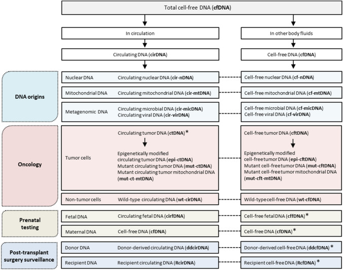 Cell-free DNA (cfDNA) has become widely recognized as a promising candidate biomarker for minimally invasive characterization of various genomic disorders and other clinical scenarios. However, among the obstacles that currently challenge the general progression of the research field, there remains an unmet need for unambiguous universal cfDNA nomenclature. To address this shortcoming, we classify in this report the different types of cfDNA molecules that occur in the human body based on its origin, genetic traits, and locality. We proceed by assigning existing terms to each of these cfDNA subtypes, while proposing new terms and abbreviations where clarity is lacking and more precise stratification would be beneficial. We then suggest the proper usage of these terms within different contexts and scenarios, focusing mainly on the nomenclature as it relates to the domains of oncology, prenatal testing, and post-transplant surgery surveillance. We hope that these recommendations will serve as useful considerations towards the establishment of universal cfDNA nomenclature in the future. In addition, it is conceivable that many of these recommendations can be transposed to cell-free RNA nomenclature by simply exchanging "DNA" with "RNA" in each acronym/abbreviation. Similarly, when describing DNA and RNA collectively, the suffix can be replaced with "NAs" to indicate nucleic acids.