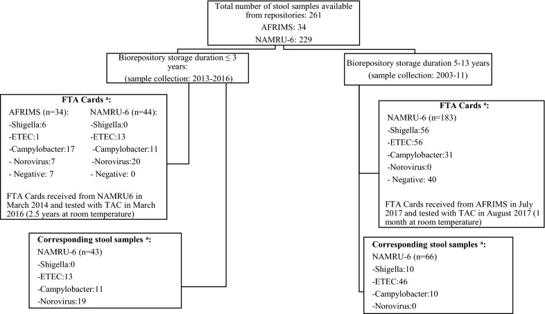 Objective: Stool repositories are a valuable resource for retrospective analyses including quantitative PCR assays to distinguish between asymptomatic shedding and clinical disease. The suitability of archival specimens for this purpose is unclear and requires assessment. We conducted a pilot study to evaluate pathogen detection by TaqMan Array Card (TAC) in travelers' diarrhea (TD) stool specimens stored for 1-13 years, as well as the impact of transporting specimens on Whatman FTA Elute cards (FTA Cards) on detection.