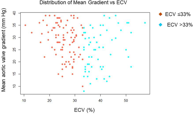 Results: During a median follow-up of 13.9 months (range 0.07 to 28.9 months), there were 31 death+HFH events (21%). Patients who experienced death+HFH had a greater median Society of Thoracic Surgery score (9.9 vs. 4.7; p < 0.01), lower left ventricular ejection fraction (42.3 ± 20.2% vs. 52.7 ± 17.2%; p < 0.01), lower mean transvalvular gradient (24.9 ± 8.9 mm Hg vs. 28.1 ± 7.3 mm Hg; p = 0.04) and increased mean ECV (35.5 ± 9.6% vs. 29.9 ± 8.2%; p < 0.01) compared with patients who did not experience death+HFH. In a multivariable Cox proportional hazards model, increase in ECV was associated with increase in death+HFH, (hazard ratio per 1% increase: 1.04, 95% confidence interval: 1.01 to 1.09; p < 0.01).