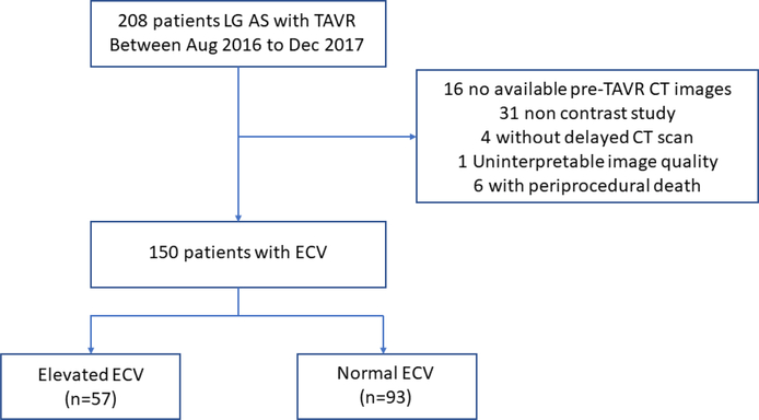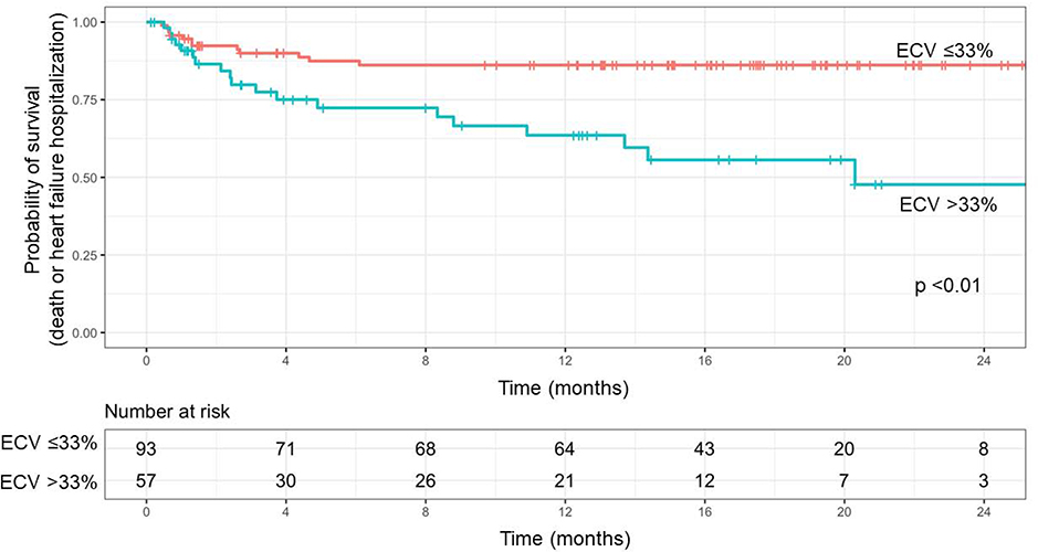 Methods: In 150 LFLG patients with AS who underwent TAVR, ECV was quantified using pre-TAVR CTA. Echocardiographic and clinical information including all-cause death and heart failure rehospitalization (HFH) was obtained from electronic medical records. A Cox proportional hazards model was used to evaluate the association between ECV and death+HFH.