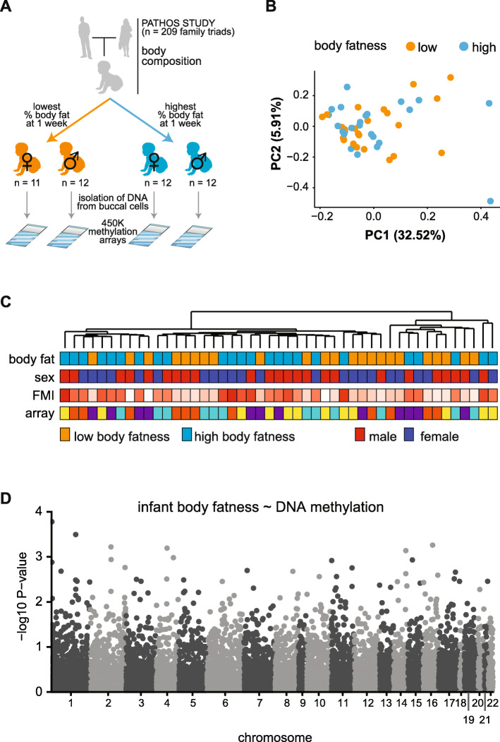 Conclusions: Despite accurate measures of body composition, we did not identify any associations between infant body fatness and DNA methylation. These results are consistent with recent studies that generally have identified only weak associations between DNA methylation and birthweight. Although our results should be confirmed by additional larger studies, our findings may suggest that differences in DNA methylation between individuals with low and high body fatness may be established later in childhood.