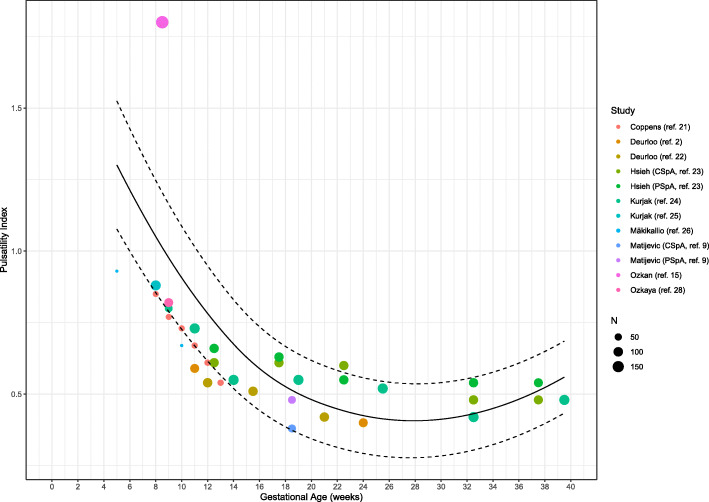 Results: In healthy pregnancies, PI and RI decreased from 0.80 (95% CI: 0.70-0.89) and 0.50 (95% CI: 0.47-0.54) in the first trimester to 0.50 (95% CI: 0.45-0.55, p < 0.001) and 0.39 (95% CI: 0.37-0.42, p < 0.001) in the second trimester and to 0.49 (95% CI: 0.44-0.53, p = 0.752) and 0.36 (95% CI: 0.35-0.38, p = 0.037) in the third trimester, respectively. In parallel, PSV altered from 0.22 m/s (95% CI: 0.13-0.30 m/s) to 0.28 m/s (95% CI: 0.17-0.40 m/s, p = 0.377) and to 0.25 m/s (95% CI: 0.20-0.30 m/s, p = 0.560) in the three trimesters. In absence of second and third trimester Doppler data in complicated gestation, only a difference in PI was observed between complicated and healthy pregnancies during the first trimester (1.49 vs 0.80, p < 0.001). Although individual studies have identified differences in PI between SpA located in the central part of the placental bed versus those located at its periphery, this meta-analysis could not confirm this (p = 0.349).
