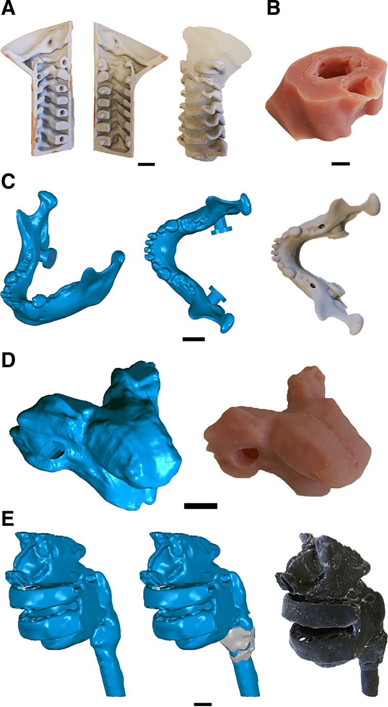 Methods: After ethics approval, available/archived computerized tomography data sets of patients under the age of 2 years were reviewed to identify those suitable for designing new models. A single 21-month-old subject was selected for 3D reconstruction. Manual thresholding was then performed to produce 3D models of selected regions and tissue types within the dataset, which were either directly 3D-printed or later cast in 3D-printed molds with a variety of tissue-like silicones. A series of testing mannequins derived using this multimodal approach were then further refined following direct clinician feedback to develop a series of pediatric airway model prototypes.