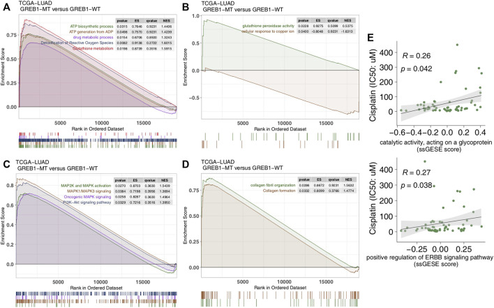 Background: Lung adenocarcinoma (LUAD) is the most common histologic type of non-small cell lung cancer (NSCLC; approximately 60%), and platinum-based chemotherapy is the cornerstone of the treatment for patients with LUAD. However, a considerable number of patients experience tumor recurrence after developing cisplatin (cis-diamminedichloroplatinum(II) or CDDP) resistance. Therefore, it is particularly important to screen primary CDDP-resistant LUAD patient populations, which can maximize the clinical benefits for these patients. Methods: Data for 61 LUAD cell lines were downloaded from the Genomics of Drug Sensitivity in Cancer (GDSC) database to screen for mutations related to CDDP susceptibility, and we conducted whole-exome sequencing (WES) of tumors from 45 LUAD patients from Zhujiang Hospital of Southern Medical University. Subsequently, the clinical prognostic value of these mutations was verified by using The Cancer Genome Atlas (TCGA)-LUAD cohort and our cohort (n = 45). Results: Based on drug sensitivity data for the GDSC-LUAD cell lines and survival analysis of the cohorts TCGA-LUAD and Local-LUAD, we found only one gene (GREB1) with mutations related to decreased CDDP sensitivity as well as worse overall survival (OS) and progression-free survival (PFS) [OS: log-rank p = 0.038, hazard ratio (HR; 95% confidence interval (95% CI)): 2.19 (0.73-6.55); PFS: log-rank p = 0.001; HR: 4.65, 95% CI: 1.18-18.37]. The GREB1-mutant (GREB1-MT) group had a higher frequency of gene mutations. Additionally, gene set enrichment analysis (GSEA) and single-sample GSEA (ssGSEA) suggested reduced accumulation of intracellular drugs in the GREB1-MT group, in addition to increased drug efflux and enhanced DNA damage repair and intracellular detoxification. Conclusion: This study found that GREB1 mutations may mediate the primary resistance and clinical prognosis of LUAD patients undergoing treatment with CDDP. Further functional analysis showed that GREB1 mutations are related to the known mechanism of CDDP resistance. These results suggest that GREB1 mutations are potential biomarkers for screening of CDDP resistance among LUAD patients.