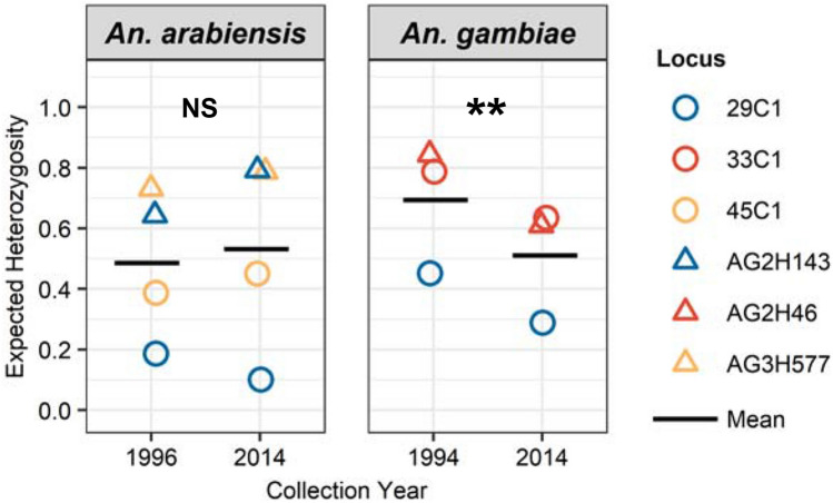 Anopheles gambiae and An. arabiensis are major malaria vectors in sub-Saharan Africa. Knowledge of how geographical factors drive the dispersal and gene flow of malaria vectors can help in combatting insecticide resistance spread and planning new vector control interventions. Here, we used a landscape genetics approach to investigate population relatedness and genetic connectivity of An. gambiae and An. arabiensis across Kenya and determined the changes in mosquito population genetic diversity after 20 years of intensive malaria control efforts. We found a significant reduction in genetic diversity in An. gambiae, but not in An. arabiensis as compared to prior to the 20-year period in western Kenya. Significant population structure among populations was found for both species. The most important ecological driver for dispersal and gene flow of An. gambiae and An. arabiensis was tree cover and cropland, respectively. These findings highlight that human induced environmental modifications may enhance genetic connectivity of malaria vectors.