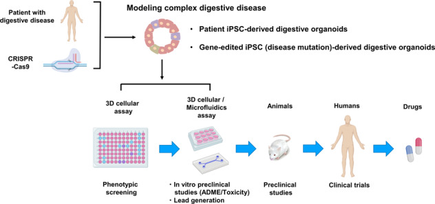 The advent of organoid technology has enabled scientists and clinicians to utilize cells from primary tissues or pluripotent stem cells (PSCs) to grow self-organizing tissue systems, thus attaining cellular diversity, spatial organization, and functionality as found within digestive tracts. The development of human gastrointestinal (GI) and hepato-biliary-pancreatic organoids as an in-a-dish model present novel opportunities to study humanistic mechanisms of organogenesis, regeneration and pathogenesis. Herein, we review the recent portfolios of primary tissue-derived and PSC-derived organoids in the digestive systems. We also discuss the promise and challenges in disease modeling and drug development applications for digestive disorders.