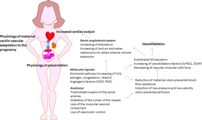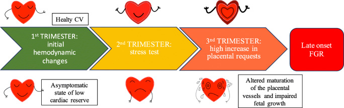 In recent years, a growing interest has arisen regarding the possible relationship between adverse pregnancy outcomes (APOs) and inadequate maternal hemodynamic adaptations to the pregnancy. A possible association between "placental syndromes," such as preeclampsia (PE) and fetal growth restriction (FGR), and subsequent maternal cardiovascular diseases (CVD) later in life has been reported. The two subtypes of FGR show different pathogenetic and clinical features. Defective placentation, due to a poor trophoblastic invasion of the maternal spiral arteries, is believed to play a central role in the pathogenesis of early-onset PE and FGR. Since placental functioning is dependent on the maternal cardiovascular system, a pre-existent or subsequent cardiovascular impairment may play a key role in the pathogenesis of early-onset FGR. Late FGR does not seem to be determined by a primary abnormal placentation in the first trimester. The pathological pathway of late-onset FGR may be due to a primary maternal cardiovascular maladaptation: CV system shows a flat profile and remains similar to those of non-pregnant women. Since the second trimester, when the placenta is already developed and increases its functional request, a hypovolemic state could lead to placental hypoperfusion and to an altered maturation of the placental villous tree and therefore to an altered fetal growth. Thus, this review focalizes on the possible relationship between maternal cardiac function and placentation in the development of both early and late-onset FGR. A better understanding of maternal hemodynamics in pregnancies complicated by FGR could bring various benefits in clinical practice, improving screening and therapeutic tools.