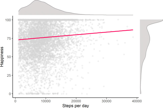 Results: The preregistered analyses demonstrated an association between physical activity and happiness. More specifically, the number of steps per day predicted the experienced happiness on that day. In addition, a short-term reciprocal effect of physical activity and happiness was observed. Happiness was predicted by the number of steps accumulated in the previous hour and it also predicted the number of steps accumulated in the subsequent hour. However, convincing evidence was found that these effects did not occur in the long-term between days. The number of steps on the previous day did not predict happiness, nor did happiness predict the number of steps of the subsequent day.