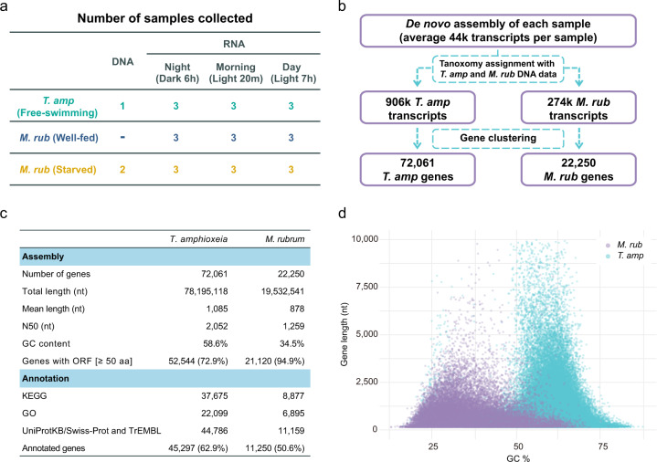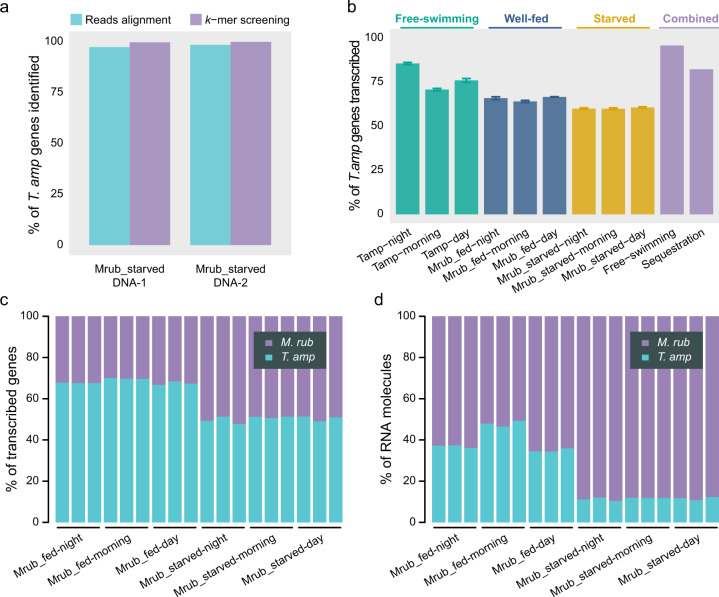 The marine ciliate Mesodinium rubrum is famous for its ability to acquire and exploit chloroplasts and other cell organelles from some cryptophyte algal species. We sequenced genomes and transcriptomes of free-swimming Teleaulax amphioxeia, as well as well-fed and starved M. rubrum in order to understand cellular processes upon sequestration under different prey and light conditions. From its prey, the ciliate acquires the ability to photosynthesize as well as the potential to metabolize several essential compounds including lysine, glycan, and vitamins that elucidate its specific prey dependency. M. rubrum does not express photosynthesis-related genes itself, but elicits considerable transcriptional control of the acquired cryptophyte organelles. This control is limited as light-dependent transcriptional changes found in free-swimming T. amphioxeia got lost after sequestration. We found strong transcriptional rewiring of the cryptophyte nucleus upon sequestration, where 35% of the T. amphioxeia genes were significantly differentially expressed within well-fed M. rubrum. Qualitatively, 68% of all genes expressed within well-fed M. rubrum originated from T. amphioxeia. Quantitatively, these genes contributed up to 48% to the global transcriptome in well-fed M. rubrum and down to 11% in starved M. rubrum. This tertiary endosymbiosis system functions for several weeks, when deprived of prey. After this point in time, the ciliate dies if not supplied with fresh prey cells. M. rubrum represents one evolutionary way of acquiring photosystems from its algal prey, and might represent a step on the evolutionary way towards a permanent tertiary endosymbiosis.