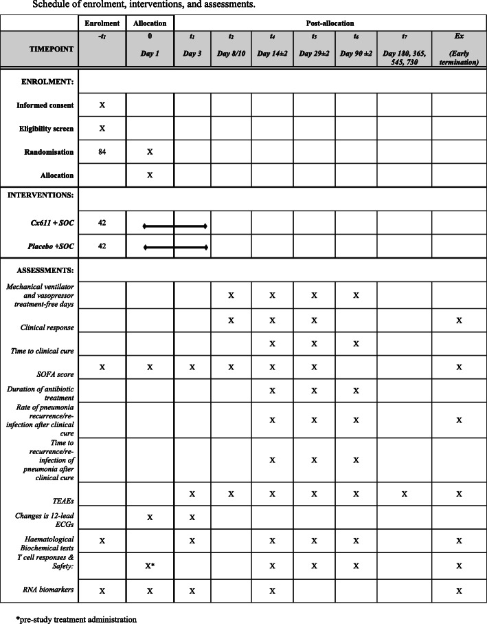 Methods: In addition to standard of care according to local guidelines, we will administer eASCs (Cx611) or placebo intravenously as adjunctive therapy to patients with sCABP. Enrolment is planned for approximately 180 patients who will be randomised to treatment groups in a 1:1 ratio according to a pre-defined randomization list. An equal number of patients is planned for allocation to each group. Cx611 will be administered on Day 1 and on Day 3 at a dose of 160 million cells (2 million cells / mL, total volume 80 mL) through a 20-30 min (240 mL/hr) intravenous (IV) central line infusion after dilution with Ringer Lactate solution. Placebo (Ringer Lactate) will also be administered through a 20-30 min (240 mL/hr) IV central line infusion at the same quantity (total volume of 80 mL) and following the same schedule as the active treatment. The study was initiated in January 2017 and approved by competent authorities and ethics committees in Belgium, Spain, Lithuania, Italy, Norway and France; monitoring will be performed at regular intervals. Funding is from the European Union's Horizon 2020 Research and Innovation Program.
