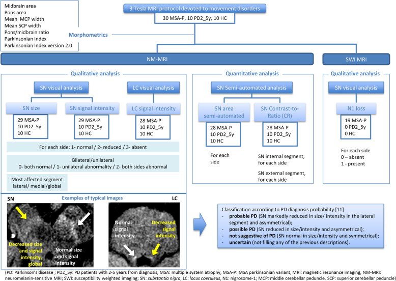 Methods: Simple visual imaging analysis of the substantia nigra and locus coeruleus in neuromelanin-sensitive magnetic resonance imaging and nigrosome 1 in susceptibility-weighted sequences was performed in thirty patients with parkinsonian variant of multiple system atrophy fulfilling possible/probable second consensus diagnostic criteria. The neuromelanin visual pattern was compared to patients with Parkinson's disease with the same disease duration (n = 10) and healthy controls (n = 10). Substantia nigra semi-automated neuromelanin area/signal intensity was compared to the visual data.