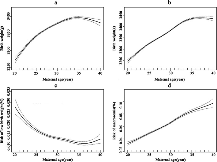 Results: The relationships between maternal age and birth weight, risk of low birth weight, and risk of macrosomia were nonlinear. Birth weight increased 16.204 g per year when maternal age was less than 24 years old (95%CI: 14.323, 18.086), and increased 12.051 g per year when maternal age ranged from 24 to 34 years old (95%CI: 11.609, 12.493), then decreased 0.824 g per year (95% CI: -3.112, 1.464). The risk of low birth weight decreased with the increase of maternal age until 36 years old (OR = 0.917, 95%CI: 0.903, 0.932 when maternal age was younger than 27 years old; OR = 0.965, 95%CI: 0.955, 0.976 when maternal age ranged from 27 to 36 years old), then increased when maternal age was older than 36 years old (OR = 1.133, 95%CI: 1.026, 1.250). The risk of macrosomia increased with the increase of maternal age (OR = 1.102, 95%CI: 1.075, 1.129 when maternal age was younger than 24 years old; OR = 1.065, 95%CI: 1.060, 1.071 when maternal age ranged from 24 to 33 years old; OR = 1.029, 95%CI: 1.012, 1.046 when maternal age was older than 33 years old).