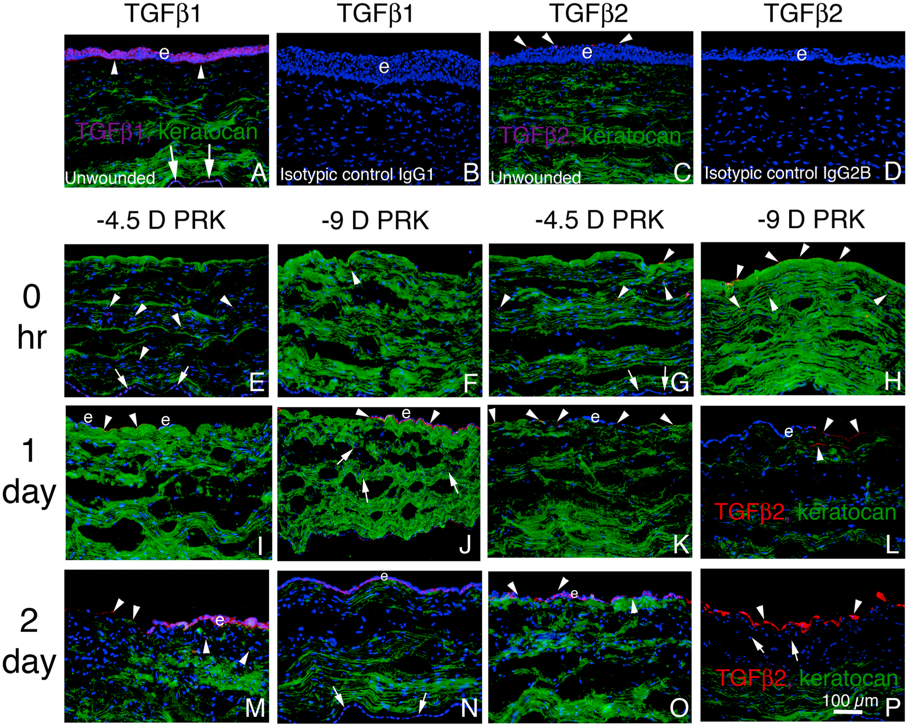 TGFβ1 and TGFβ2 proteins in corneas with and without stromal fibrosis: Delayed regeneration of apical epithelial growth factor barrier and the epithelial basement membrane in corneas with stromal fibrosis