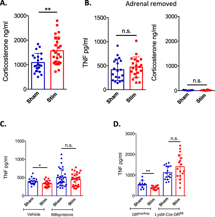 Conclusion: Carotid sinus nerve electrostimulation attenuates inflammation and protects against lipopolysaccharide-induced endotoxaemic shock via increased corticosterone acting on the glucocorticoid receptor of myeloid immune cells. These results provide a rationale for the use of carotid sinus nerve electrostimulation as a therapeutic approach for immune-mediated inflammatory diseases.