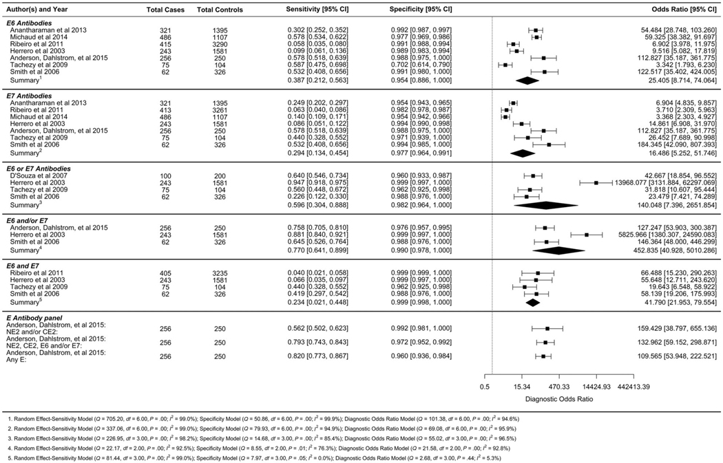 Results: One hundred thirty-seven studies were included. Among all biomarkers assessed, HPV-16 E seropositivity and circulating HPV DNA were most significantly correlated with HPV-associated cancers in comparison with cancer-free controls. In most scenarios, HPV-16 E6 seropositivity varied nonsignificantly according to tumor type, specimen collection timing, and anatomic site (crude odds ratio [cOR] for p16+ or HPV+ oropharyngeal cancer [OPC], 133.10; 95% confidence interval [CI], 59.40-298.21; cOR for HPV-unspecified OPC, 25.41; 95% CI, 8.71-74.06; cOR for prediagnostic HPV-unspecified OPC, 59.00; 95% CI, 15.39-226.25; cOR for HPV-unspecified cervical cancer, 12.05; 95% CI, 3.23-44.97; cOR for HPV-unspecified anal cancer, 73.60; 95% CI, 19.68-275.33; cOR for HPV-unspecified penile cancer, 16.25; 95% CI, 2.83-93.48). Circulating HPV-16 DNA was a valid biomarker for cervical cancer (cOR, 15.72; 95% CI, 3.41-72.57). In 3 cervical cancer case-control studies, cases exhibited unique microRNA expression profiles in comparison with controls. Other assessed biomarker candidates were not valid.