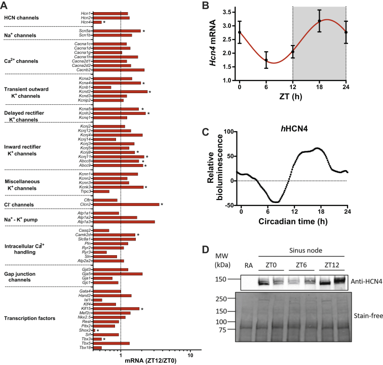 Results: The day-night difference in the average heart rate of mice was independent of fluctuations in average locomotor activity and persisted under pharmacological, surgical, and transgenic interruption of autonomic input to the heart. Spontaneous beating rate of isolated (ie, denervated) sinus node (SN) preparations exhibited a day-night rhythm concomitant with rhythmic messenger RNA expression of ion channels including hyperpolarization-activated cyclic nucleotide-gated potassium channel 4 (HCN4). In vitro studies demonstrated 24-hour rhythms in the human HCN4 promoter and the corresponding funny current. The day-night heart rate difference in mice was abolished by HCN block, both in vivo and in the isolated SN. Rhythmic expression of canonical circadian clock transcription factors, for example, Brain and muscle ARNT-Like 1 (BMAL1) and Cryptochrome (CRY) was identified in the SN and disruption of the local clock (by cardiomyocyte-specific knockout of Bmal1) abolished the day-night difference in Hcn4 and intrinsic heart rate. Chromatin immunoprecipitation revealed specific BMAL1 binding sites on Hcn4, linking the local clock with intrinsic rate control.