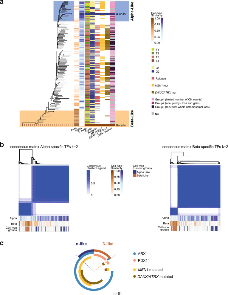 Recent data suggest that Pancreatic Neuroendocrine Tumours (PanNETs) originate from α- or β-cells of the islets of Langerhans. The majority of PanNETs are non-functional and do not express cell-type specific hormones. In the current study we examine whether tumour DNA methylation (DNAme) profiling combined with genomic data is able to identify cell of origin and to reveal pathways involved in PanNET progression. We analyse genome-wide DNAme data of 125 PanNETs and sorted α- and β-cells. To confirm cell identity, we investigate ARX and PDX1 expression. Based on epigenetic similarities, PanNETs cluster in α-like, β-like and intermediate tumours. The epigenetic similarity to α-cells progressively decreases in the intermediate tumours, which present unclear differentiation. Specific transcription factor methylation and expression vary in the respective α/β-tumour groups. Depending on DNAme similarity to α/β-cells, PanNETs have different mutational spectra, stage of the disease and prognosis, indicating potential means of PanNET progression.