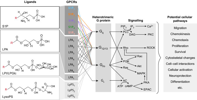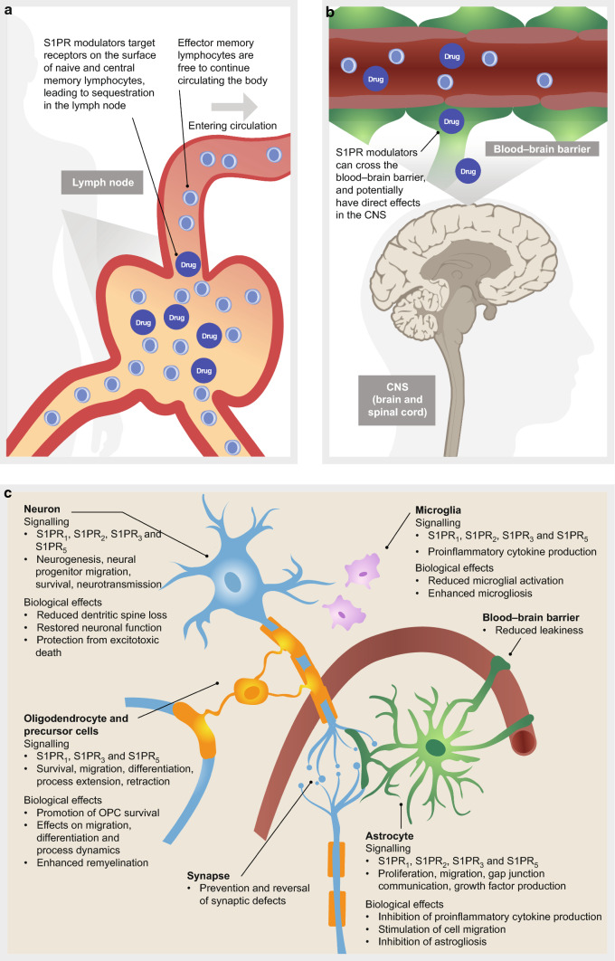 Lysophospholipids are a class of bioactive lipid molecules that produce their effects through various G protein-coupled receptors (GPCRs). Sphingosine 1-phosphate (S1P) is perhaps the most studied lysophospholipid and has a role in a wide range of physiological and pathophysiological events, via signalling through five distinct GPCR subtypes, S1PR1 to S1PR5. Previous and continuing investigation of the S1P pathway has led to the approval of three S1PR modulators, fingolimod, siponimod and ozanimod, as medicines for patients with multiple sclerosis (MS), as well as the identification of new S1PR modulators currently in clinical development, including ponesimod and etrasimod. S1PR modulators have complex effects on S1PRs, in some cases acting both as traditional agonists as well as agonists that produce functional antagonism. S1PR subtype specificity influences their downstream effects, including aspects of their benefit:risk profile. Some S1PR modulators are prodrugs, which require metabolic modification such as phosphorylation via sphingosine kinases, resulting in different pharmacokinetics and bioavailability, contrasting with others that are direct modulators of the receptors. The complex interplay of these characteristics dictates the clinical profile of S1PR modulators. This review focuses on the S1P pathway, the characteristics and S1PR binding profiles of S1PR modulators, the mechanisms of action of S1PR modulators with regard to immune cell trafficking and neuroprotection in MS, together with a summary of the clinical effectiveness of the S1PR modulators that are approved or in late-stage development for patients with MS. Sphingosine 1-phosphate receptor modulator therapy for multiple sclerosis: differential downstream receptor signalling and clinical profile effects (MP4 65540 kb).