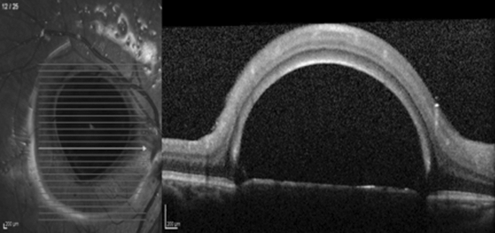 Results: In the 13 cases with subretinal PFO, hyper-reflectivity under the bubble was noted in 8 eyes (61.5%); choroidal shadow at the borders of the bubble in 11 eyes (84.6%); hyper-reflective halo around the bubble in 5 eyes (38.4%) and a hyper-reflective apical dot in 8 eyes (61.5%).The two cases with multiple PFO bubbles had complete septum dividing the bubbles. The one case with subretinal SO had hyper reflectivity under the bubble; no choroidal shadow at the edge of the bubble; hyper-reflective halo was noted around the bubble and the apical hyper-reflective dot was present; there was no complete septum dividing multiple bubbles. The single case with subretinal C3F8 had some bubbles with totally round base, incomplete septum, hyper reflectivity under the bubble, choroidal shadow at the edge of the bubble, a hyper-reflective halo and an apical dot.