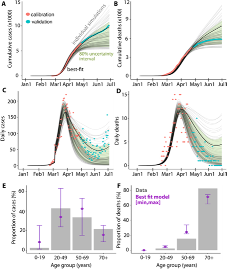 Results: The best model fit estimated ~35% pC_PI under the lockdown which prevented ~17,000 deaths by May 15. Gradually restoring 75% pC_PI for all age groups between May 15-July 15 would have resulted in ~350 daily deaths by early September 2020. Maintaining <45% pC_PI was required with current testing practices to ensure low levels of daily infections and deaths. Increased testing, isolation of symptomatic infections, and contact tracing permitted 60% pC_PI without significant increases in daily deaths before November and allowed opening of schools with <15 daily deaths. Inpatient antiviral treatment was predicted to reduce deaths significantly without lowering cases or hospitalizations.