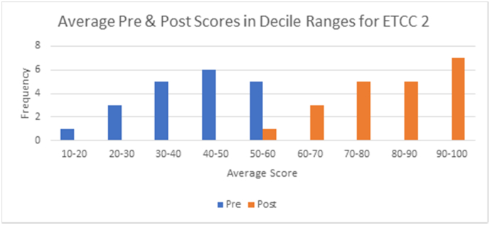 Results: ETCC 1 had 17 SAMU staff and ETCC 2 had 19 hospital staff. ETCC 1 mean scores increased from 40% to 63% and ETCC 2 increased from 41% to 78% after the course (p < 0.001 using matched pair analysis). A one-way ANOVA mean square analysis showed that regardless of the baseline level of training for each participant, all trainees reached similar post-course assessment scores, F (1) = 15.18, p = 0.0004.