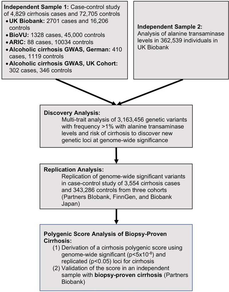 Methods: We conducted a multi-trait genome-wide association study combining cirrhosis and alanine aminotransferase levels performed in 5 discovery studies (UK Biobank, Vanderbilt BioVU, Atherosclerosis Risk in Communities study, and 2 case-control studies including 4829 individuals with cirrhosis and 72,705 controls and 362,539 individuals with alanine aminotransferase levels). Identified variants were replicated in 3 studies (Partners HealthCare Biobank, FinnGen, and Biobank Japan including 3554 individuals with cirrhosis and 343,826 controls). A polygenic score was tested in Partners HealthCare Biobank.