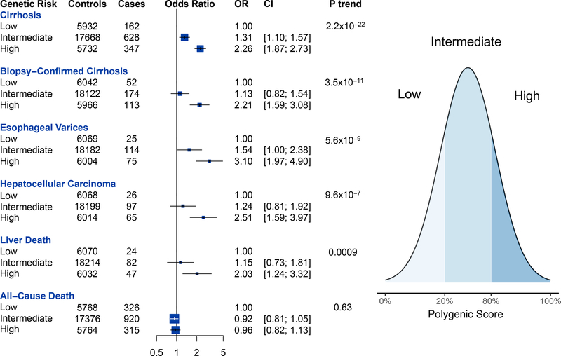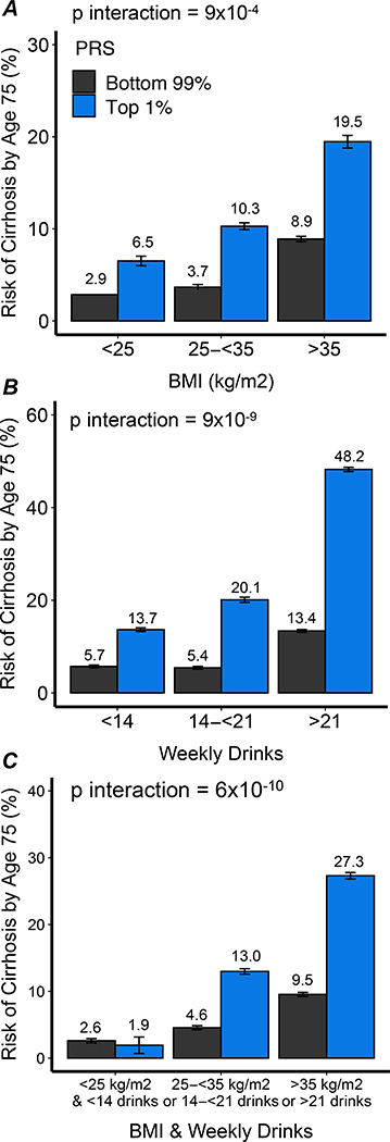 Conclusions: Twelve independent genetic variants, 7 of which are newly identified in this study, conferred risk for cirrhosis. Aggregated into a polygenic score, these variants identified a subset of the population at substantially increased risk who are most susceptible to the hepatotoxic effects of excess alcohol consumption or obesity.