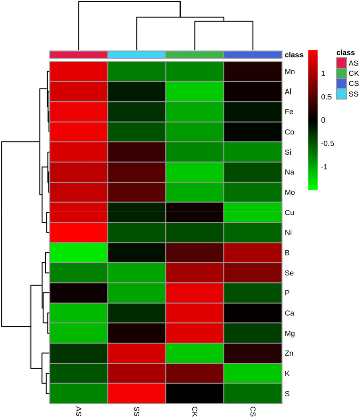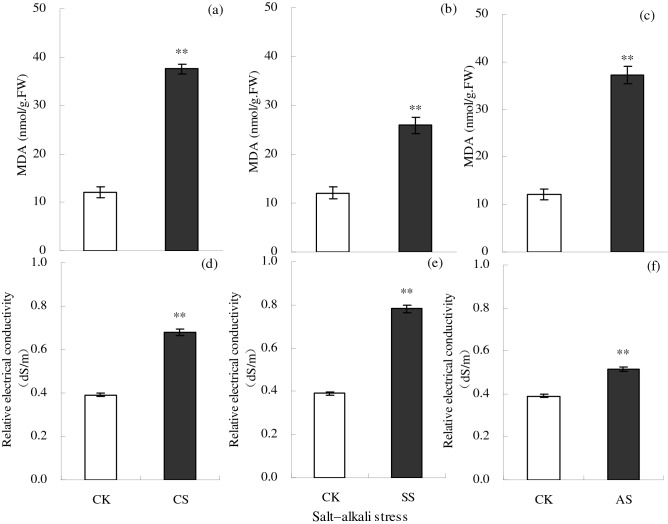 To better understand the mechanism of salt tolerance, we analyzed cotton growth and the ionomes in different tissues under different types of salt-alkali stress. Cotton was exposed to the soil salt and alkali stresses, NaCl, Na2SO4, and Na2CO3 + NaHCO3, in a pot study. Salt and alkali stress significantly inhibited cotton growth, significantly reduced root length, surface area, and volume, and significantly increased relative electrical conductivity (REC) and malondialdehyde (MDA) content but also significantly increased antioxidant enzyme activities, and proline (Pro) content. The REC in leaves was higher under salt stress than under alkali stress, but the effects on Pro were in the order Na2CO3 + NaHCO3 > NaCl > Na2SO4. Principal component analysis showed a significant difference in ion composition under the different types of salt-alkali stress. Under the three types of salt-alkali stress, concentrations of Na and Mo increased significantly in different organs of cotton plants. Under NaCl stress, the absorption of Ca was inhibited, the transport capacity of P, Mg, and Cu was reduced, and the ion balance was maintained by promoting the uptake and transport of Zn, Mn, Al, and Mo. Under Na2SO4 stress, the absorption of P and Ca was inhibited, the transport capacity of Mg, B, and Cu was reduced, and the ion balance was maintained by promoting the uptake and transport of S, Zn, Fe, Mo, Al, and Co. Under Na2CO3 + NaHCO3 stress, the absorption of P and S was inhibited, the transport capacity of Mg and B was reduced, but that of Al and Fe increased, and the ion balance was maintained by promoting the uptake and transport of Mn, Mo, Ni, and Co. The relative expression of GhSOS1 and GhNHX1 in leaves increased significantly under salt stress but decreased under alkali stress. These results suggest that cotton is well-adapted to salt-alkali stress via the antioxidant enzyme system, adjustment of osmotic substances, and reconstruction of ionic equilibrium; neutral salt stress primarily disrupts the ion balance, whereas alkali stress decreases the ability to regulate Na and inhibits the absorption of mineral elements, as well as disrupts the ion balance; and the changes in the expression of salt tolerance-related genes may partially explain the accumulation of Na ions in cotton under salt-alkali stress.
