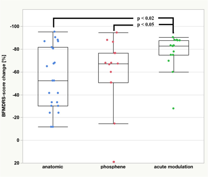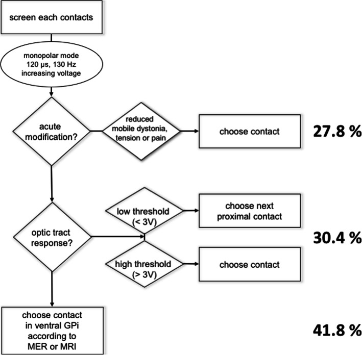 Conclusions: Monopolar review helped to detect the best therapeutic contact in approximately 30% of patients exhibiting acute modulation of dystonic symptoms. Acute improvement, as well as worsening of dystonia, predicted a good long-term outcome, while induction of phosphenes did not correlate with outcome.