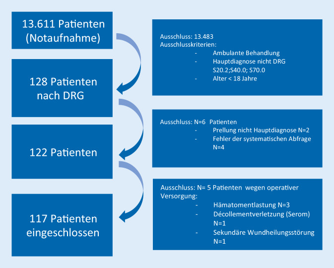 Methodik: Es erfolgte die Abfrage der Patienten entsprechend den Entlassdiagnosen aus dem krankenhausinternen Informationssystem (KIS). Eingeschlossen wurden 117 Patienten in einem Zeitraum von 2 Jahren. Es erfolgten hier die Klassifizierung nach Unfallmechanismus sowie die Einteilung in Altersgruppen. Des Weiteren erfolgte die Kostenkalkulation anhand von abteilungs- und klinikspezifischen Tagessätzen.