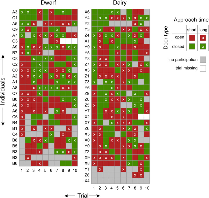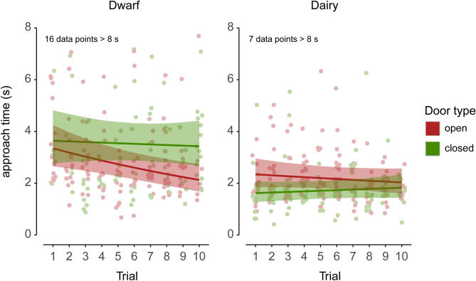 Contrafreeloading (CFL) is the phenomenon when animals work for a resource although an identical resource is available for free. Possible explanations for CFL are that animals seek context for species-specific behaviours or to control their environments. We investigated whether goats show CFL and whether breeding for productivity traits has altered its occurrence. In a manipulation task, we compared two selection lines: 27 Nigerian dwarf goats, not bred for productivity traits, and 30 dairy goats, bred for high milk yield. Over 10 trials, each goat could perform one of three behaviours: not participating in the trial, feeding for free from an open door, or opening a sliding door for a feed of similar value. The results were analysed using an Item Response Tree (IRTree) generalized linear mixed model (GLMM). The fitted probabilities to participate were > 0.87 over all trials in both selection lines. For dwarf goats, the probability of choosing the closed door, and thereby demonstrating CFL, increased from 0.30 in Trial 1 to 0.53 in Trial 10. For dairy goats, this probability was constant at approximately 0.43. Unlike dwarf goats, dairy goats were faster to approach the closed compared to the open door. Overall, our results suggest that both selection lines were similarly interested in CFL.