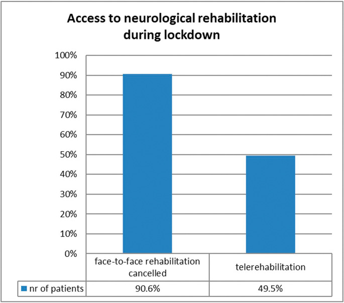 Results: 49.1% experienced at least one symptom during the study period, but no child developed severe complications. The prevalence of symptoms was significantly lower during lockdown than during the previous two months. The underlying neurological condition worsened in 11.5% of the patients. Children who regularly left the home during lockdown were greater risk of exhibiting symptoms. During lockdown, 67.7% had a specialist appointment cancelled, 52.6% contacted their paediatrician, and 30.9% contacted their child neuropsychiatrist. Among patients who usually receive rehabilitation, 49.5% continued remotely.