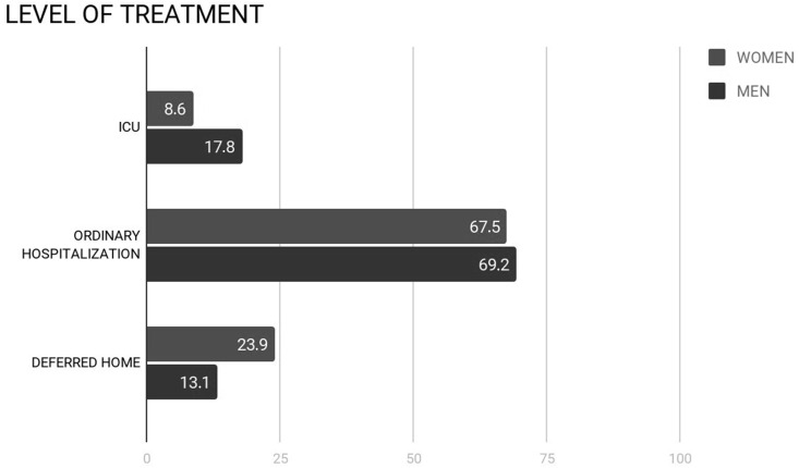 Results: Males and females had the same age distribution. No statistically significant difference was found in the analysed CT features and in the CT score (p=0.31) between the sexes. More females were affected by two or more comorbidities (17.1% versus 7.5%, p=0.024), all comorbidities except diabetes were more prevalent in females. Women had a higher probability to be discharged home and a lower probability to be admitted to the intensive care unit (ICU; p=0.008), in-hospital mortality was inferior (13.5% versus 22%).